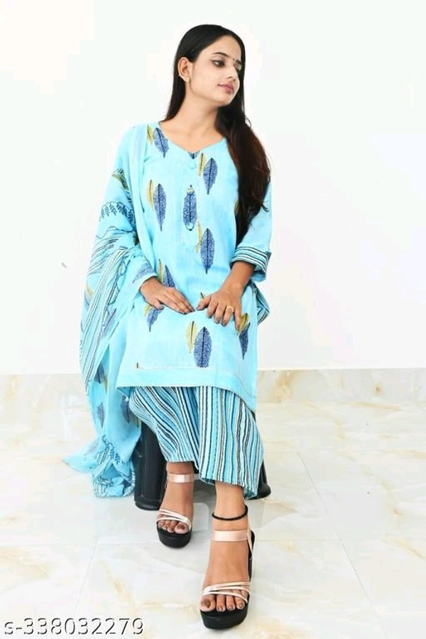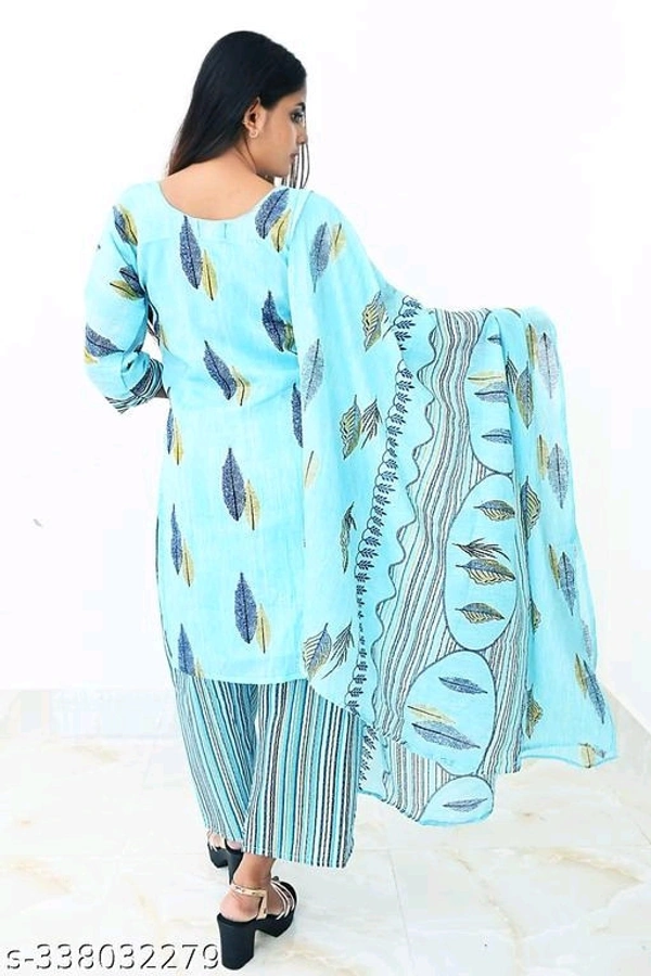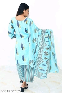 1. **Elegant Design**: The set features a beautifully printed Kurti, Plazo, and Dupatta, designed to blend tradition with contemporary style.