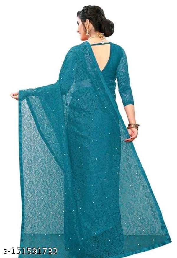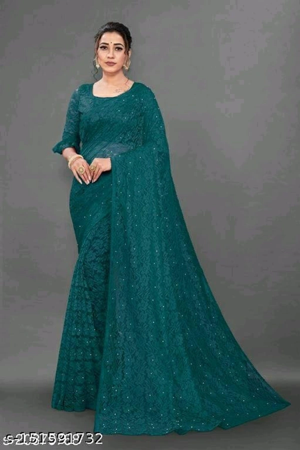 Saree length: 6.30 meters including 0.80 meters blouse pcs.Light comfortable to wear,casual wear, perfect for festival.fashion net Jacquard fabric saree.Moti Work Saree.